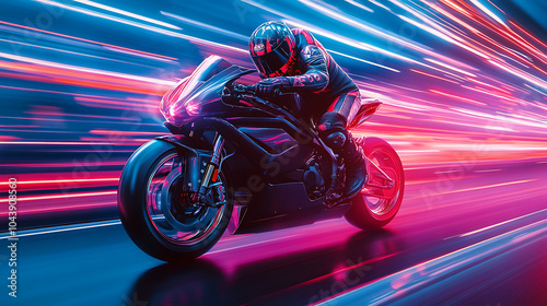 Motorcycle racing through vibrant neon light trails at high speed.