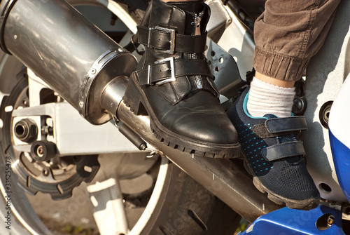 Motorcycle wheel closeup. Motorcycle metal parts. Biker meeting in the city. Children sit on a motorcycle. Little legs close up.