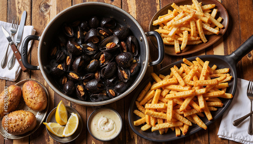 Moules-frites feast, aromatic seafood pot with crispy fries and savory dipping sauce
