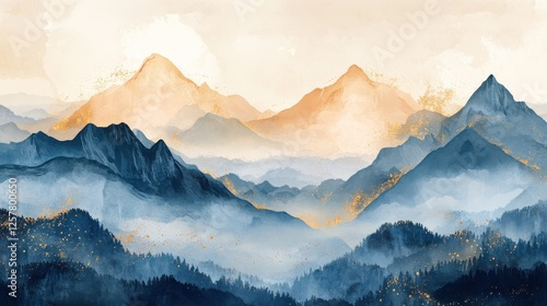 Mountain background vector. Minimal landscape art with watercolor brush and golden line art texture. Abstract art wallpaper for prints, Art Decoration, wall arts and canvas prints.