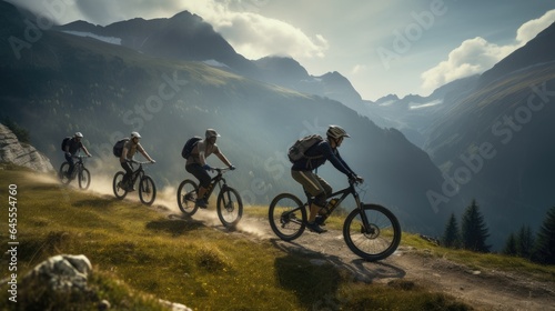 Mountain bike riders, Scenic landscape maountain range view, generative ai