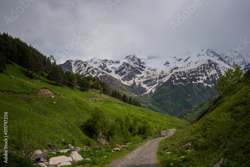 Mountain bright landscape with snow-capped mountain peaks in the distance. A steep rocky mountainside covered with green grass and fir trees.