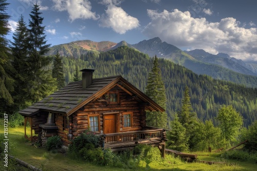 Mountain cabin surrounded by forest with majestic peaks in the background during golden hour
