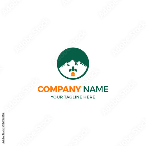 Mountain, Cloud, and Pine Tree Logo Template with Circular Frame