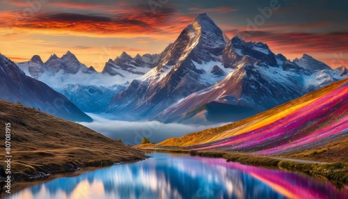 Mountain Dreamscape, Valley with Rainbow Flower Fields and Lake