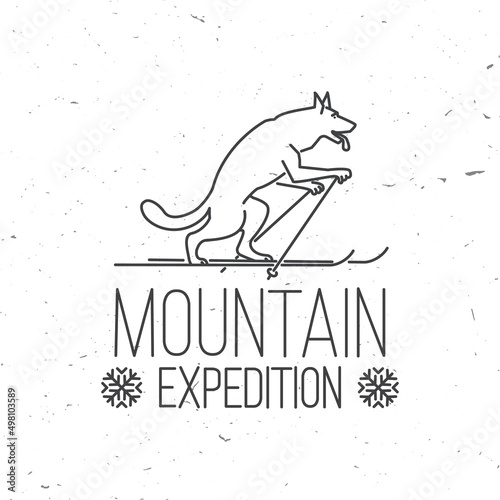 Mountain expedition concept with wolf. Concept for shirt, print, seal or stamp. Wild wolf. Line art design- stock vector. Family vacation, activity or travel. For logo design, patches or badges.