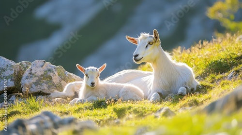 Mountain Goat Mother and Kid Resting Meadow