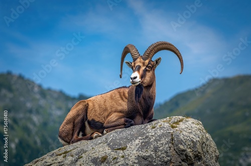 Mountain goat resting on a stone showcasing large curved horns