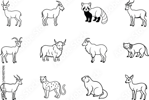Mountain Hill Mammals Line Art Collection with goat, ibex, markhor, tahr, snow leopard, marmot