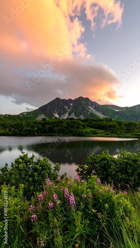 Mountain lake at dawn, vibrant colors