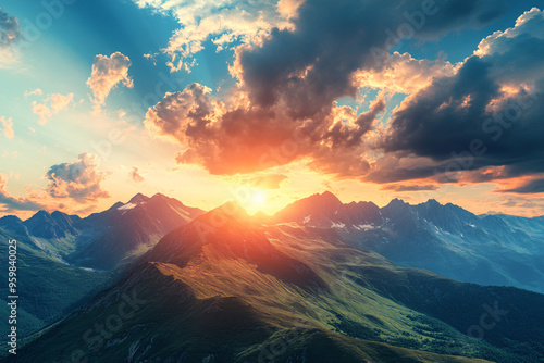 Mountain landscape at sunrise with dramatic clouds and sun rays breaking through highlighting natural beauty and tranquility