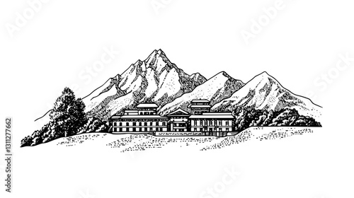 Mountain landscape detailed in engraved illustration featuring an intricate building surrounded by majestic peaks