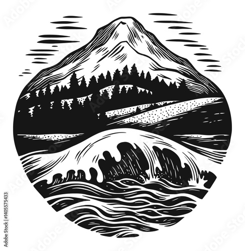 Mountain Landscape Engraving with Trees and Ocean Waves Design