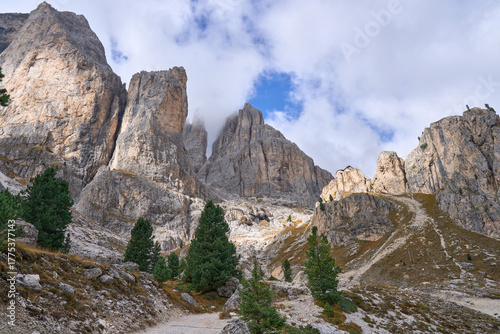 Mountain landscape in the heart of the Catinaccio group, beneath the Vajolet Towers in the Dolomites. A small Paul Preuss refuge overlooking the Vajolet Valley. Popular hiking area for a whole family.