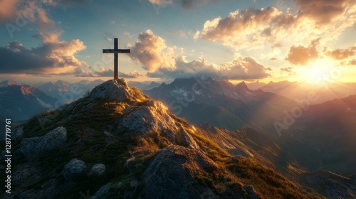 Mountain landscape with a cross at sunrise, vibrant sky and clouds over peaks. Spirituality and meditation concept