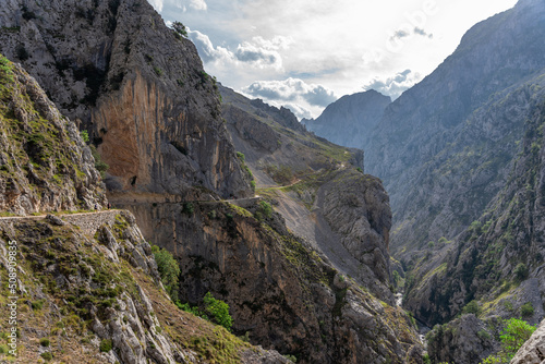 mountain landscape with a rocky valley, the cloudy skie and a hiking path