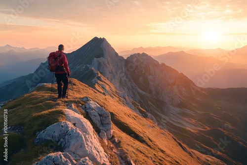 Mountain landscape with a tourist standing on the top at sunrise, conquering the summit