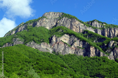 Mountain landscape with a view of rocks, grass and trees in Chechnya