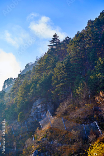 Mountain landscape with forest and blue sky in Austrian Alps. Salzkammergut region