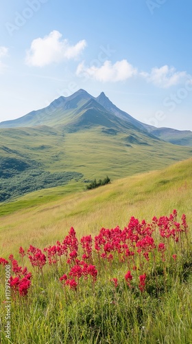Mountain Landscape with Red Wildflowers in Foreground Under Blue Sky with Clouds