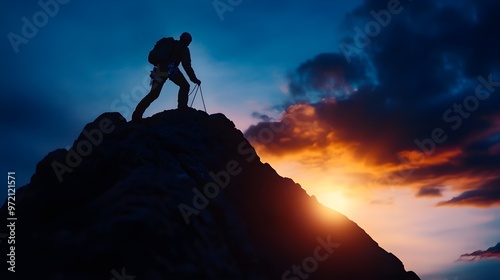 mountain peak, challenge, adventure, determination, natural beauty, close up, focus on, copy space, cool tones, dramatic lighting, Double exposure silhouette with a climber
