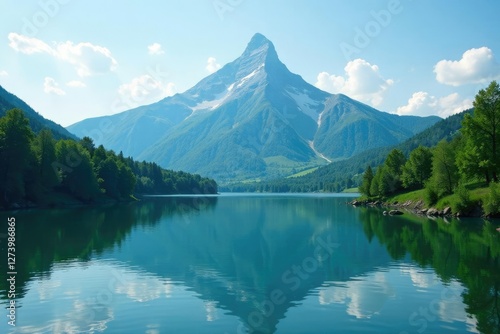 Mountain peak with lush greenery and serene lake, mountain, natural scenery, trees