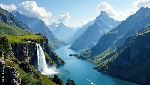 Mountain peaks with waterfalls cascading down, , mountain peaks