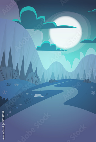 Mountain Range Spring Night Landscape Country Road Nature Background Flat Vector Illustration