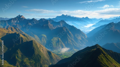 Mountain range vista at sunrise, valleys below, scenic landscape, serene atmosphere