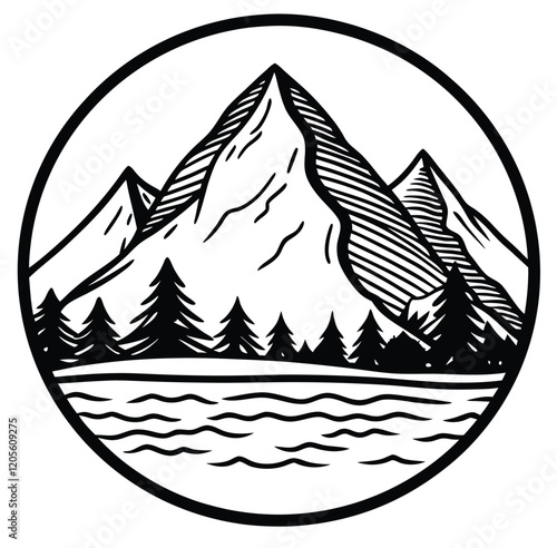 Mountain snow, river, and forest landscape scene logo silhouette illustration vector. clean, simple lines. black and white. for photo overlays t-shirt print flyer poster design.