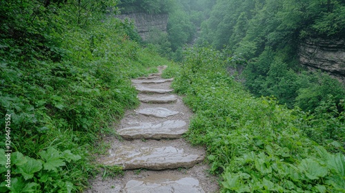 Mountain stone path after rain, lush green valley. Hiking trail use