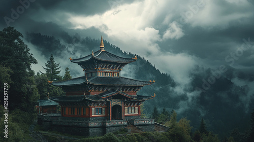 Mountain temple standing majestically against a stormy sky during twilight