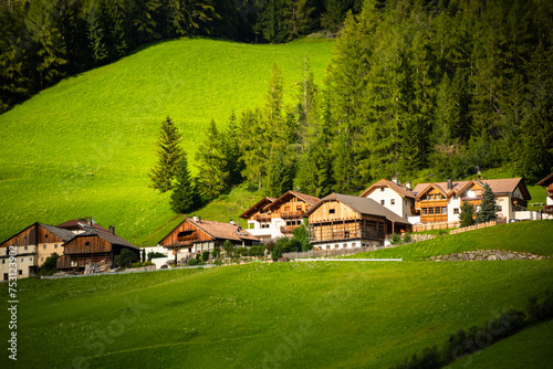 Mountain village with a church in Dolomite alps in summer among green meadows