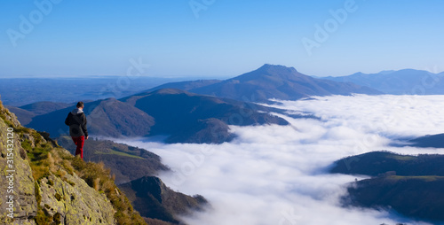 Mountaineer on top of the mountain with sea of clouds in the background, Aiako Harriak Natural Park, Euskadi