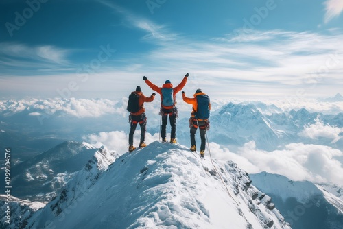 Mountaineers reaching summit, celebrating success with arms raised high