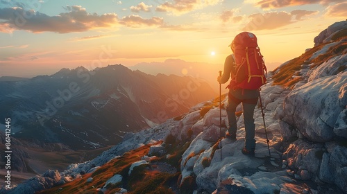 Mountainous Hiker Navigates Steep Rocky Ascent Towards Distant Peaks at Sunset