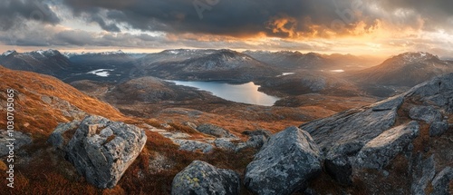 Mountainous Landscape with a Lake at Sunset and Dramatic Clouds
