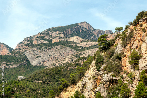 Mountains in Catalonia with the Pyrenees mountains in the background.