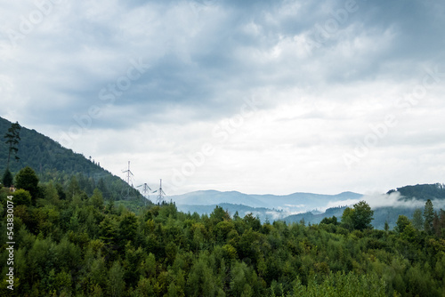 mountains in fog, coniferous forest