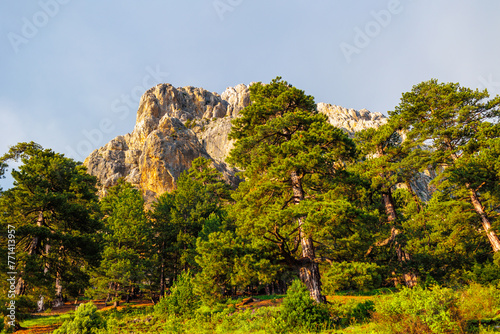 Mountains in the clouds. Aerial view of a mountain peak with green trees in the fog. Beautiful landscape with high cliffs, sky. Dedegol. Turkey.