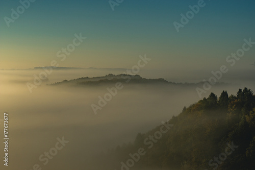 mountains in the foggy golden hour