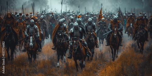 Mounted detachment of medieval knights in metal armor and helmets ready for battle. Historical reconstruction of a battle on the battlefield.