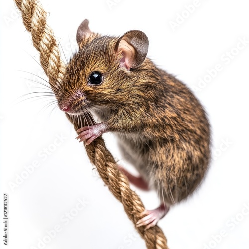 Mouse climbing rope, studio shot, white background, rodent, pet