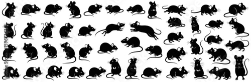 Mouse silhouette collection with playful poses such as sitting, running, holding food, and standing upright. Perfect for children's books, cartoons, or pest control