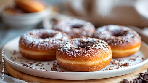 Mouthwatering donuts, sweet delights for any palate, culinary creations dusted with sweet powdered sugar, chocolate, biscuit crumbs, and cream.