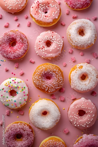 Mouthwatering donuts, sweet delights for any palate, culinary creations dusted with sweet powdered sugar, chocolate, biscuit crumbs, and cream.