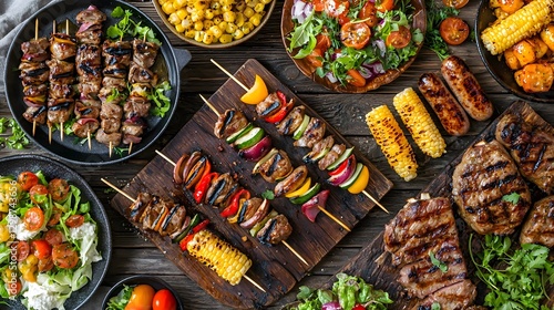 Mouthwatering Outdoor Barbecue Feast with Diverse Grilled Dishes Artfully Arranged on Rustic Wooden Table