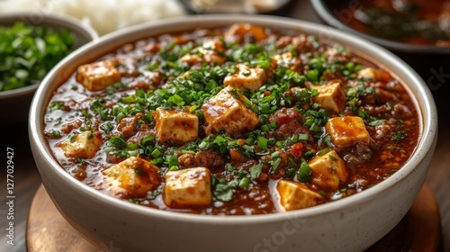 Mouthwatering tofu with spicy savory sauce topped with fresh herbs. Generative AI