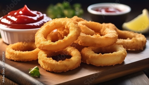 Mouthwatering Treat: Close-Up of Golden Onion Rings with Ketchup