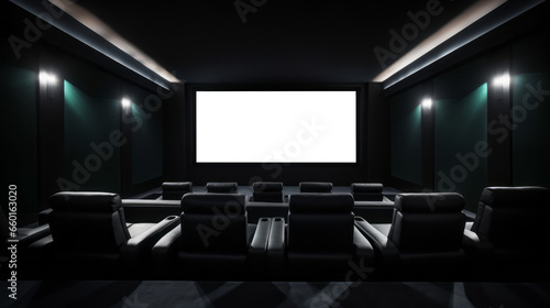Movie cinema hall interior with rows of seats and white blank mockup screen. Ai generative illustration
